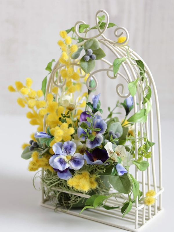 ベースにワイヤー鳥かごを使って春のお庭の片隅のようなナチュラルな雰囲気に仕上げました。