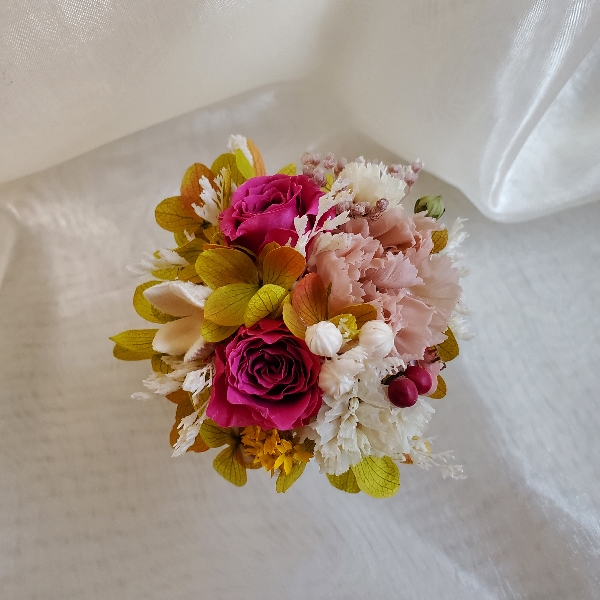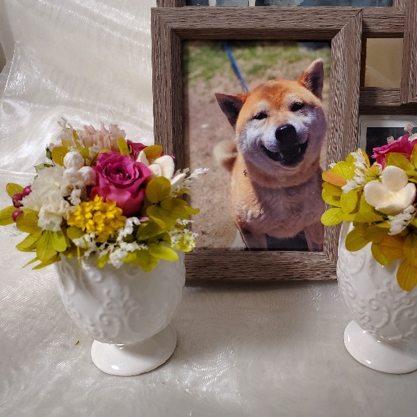 お供え花だけど、明るい雰囲気にしたくて、小さな可愛いクレイの花器に明るいめのプリザーブドフラワーを飾りました。