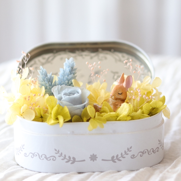 春の庭でプリザーブドフラワーに囲まれて