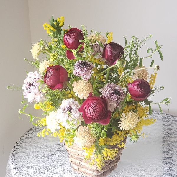 旬のラナンキュラスとスカビオサをふんだんに使い