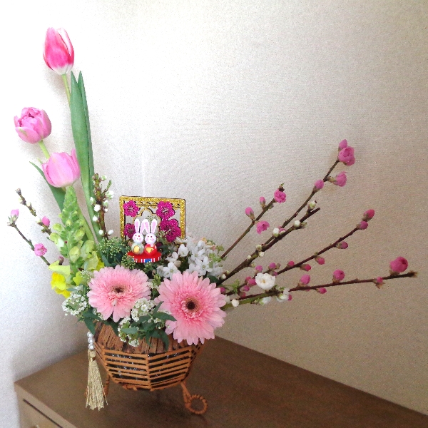 雛祭りのアレンジメントを生花で作ってみました。