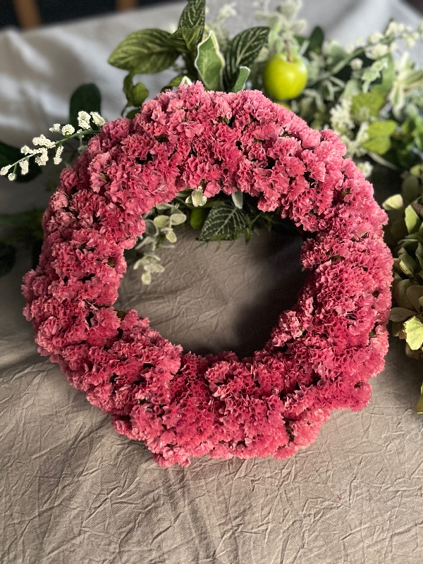 スターチスのもこもことした風合いが面白く、お日様のような温かみのあるリースになりました。