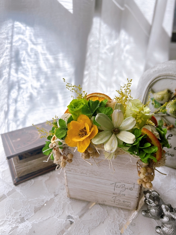 オレンジスライスのドライをふんだんに使い、新緑を思わせる2種類の緑のバラのプリザーブドフラワーを中心に作りました。オレンジ色のアネモネやグリーンのシードフラワーもアクセントになってます。