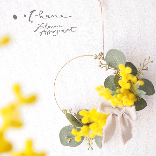 ミモザに存在感があるので、ユーカリとリボンはシンプルにしました。