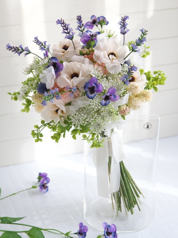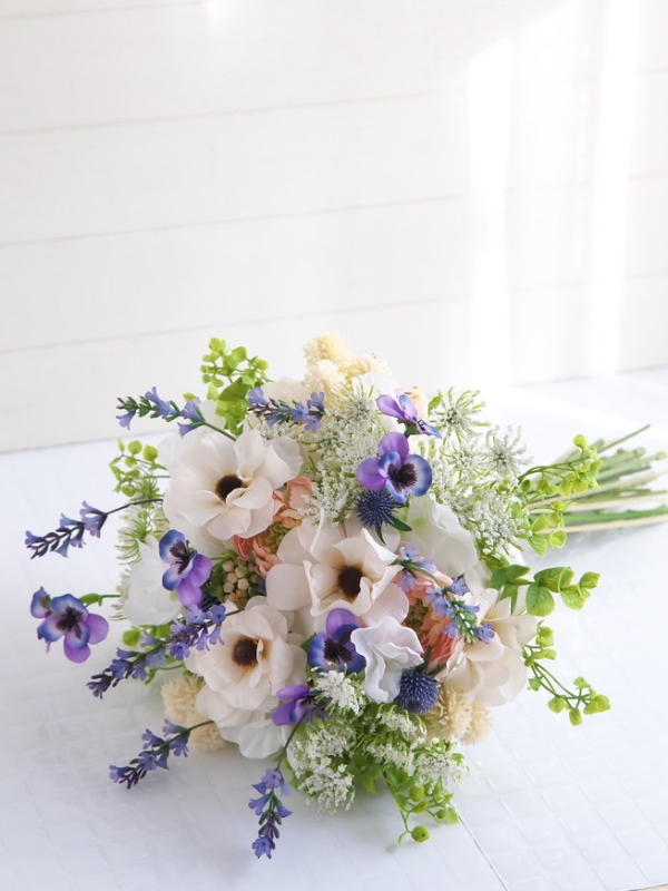 ラナンキュラス・ラベンダー・スイトピー・ビオラ・レースフラワー等の花材を爽やかで優しいイメージでブーケに束ねました。