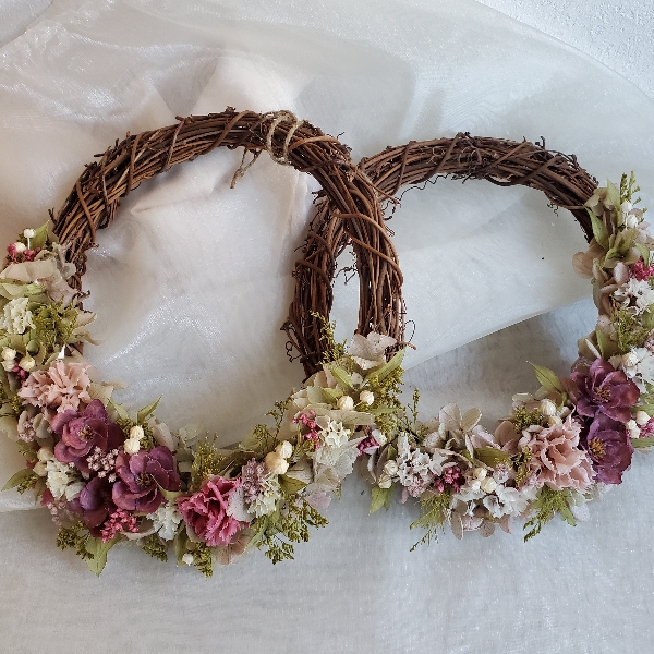 玄関に華々しくかざるというよりも、リビングや、廊下、食卓テーブルの上、寝室のドアなど、生活する中でふと目にした瞬間に優しい気持ちになれるようなさりげないお花飾りを目指しています