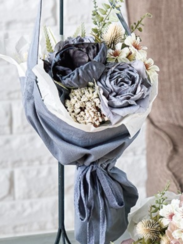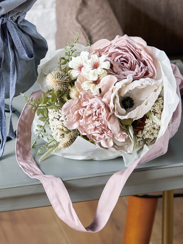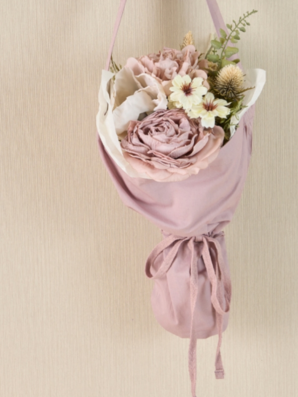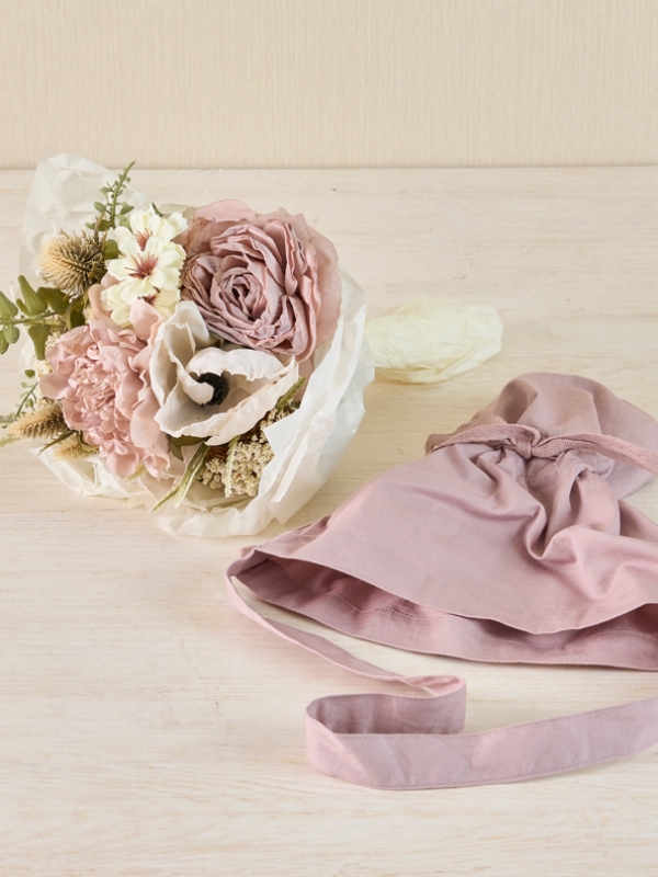 アンティーク調のシックな色合いの花をまとめて束にし、コットンツイルバッグに入れています。