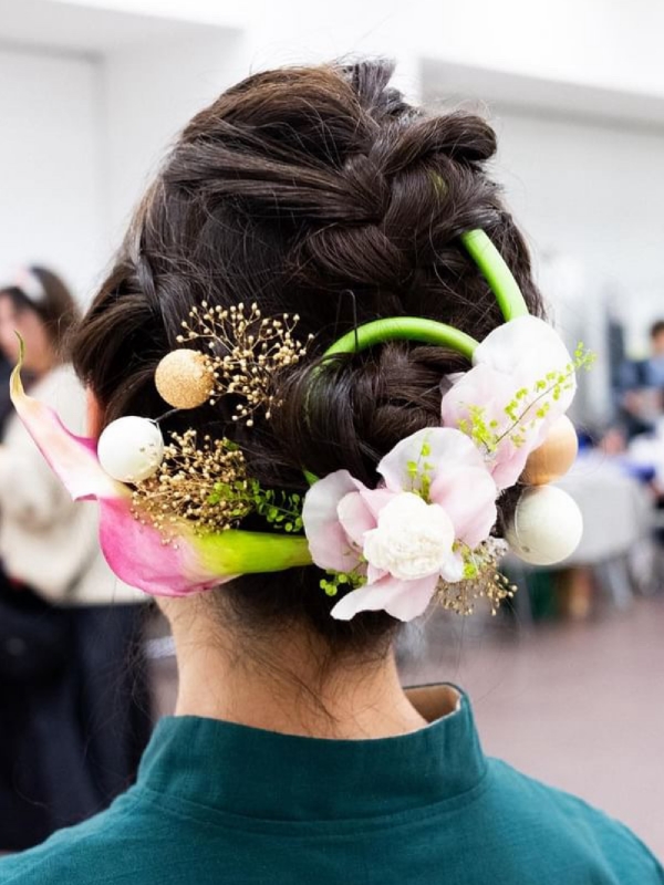 落ち着いた桃色の訪問着に合わせたカラーの髪飾りです。着物ショーでの使用というお話だったので、遊びのあるデザインにしました。