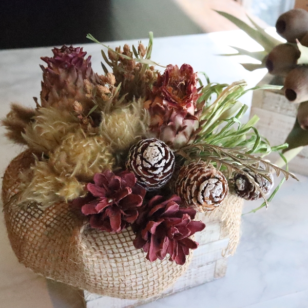 白のBOXに麻のリボンを入れてアレンジしました。アーティチョークがメインのドライフラワーBOXです。