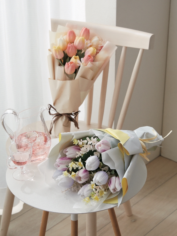 韓国で人気なチューリップ花束。ニュアンスカラーのチューリップをメイン花として使用し、クリームイエローが可愛いらしい小花をあしらいました。リバーシブルのラッピングペーパーで韓国風ラッピングをしてトレンド感を演出。お祝いの花束としても活躍するアレンジです。