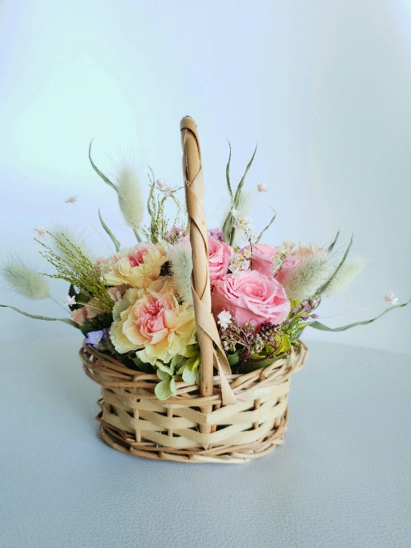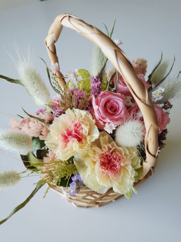 ラタンのバスケットにプリザーブドフラワーのカーネーション、バラや小花、グリーン類をあしらったした可愛らしいバスケットアレンジメントです。