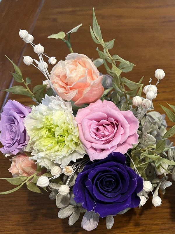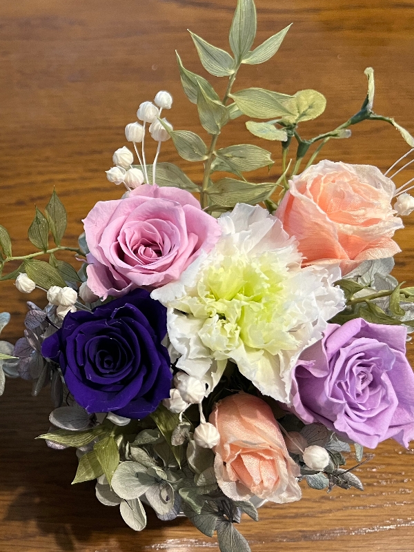 好きな薔薇を入れて左右対称になるように、仏壇の供花を作って欲しいとのオーダーで、初めてブリザーブドフラワーのアレンジメントに挑戦しました。
