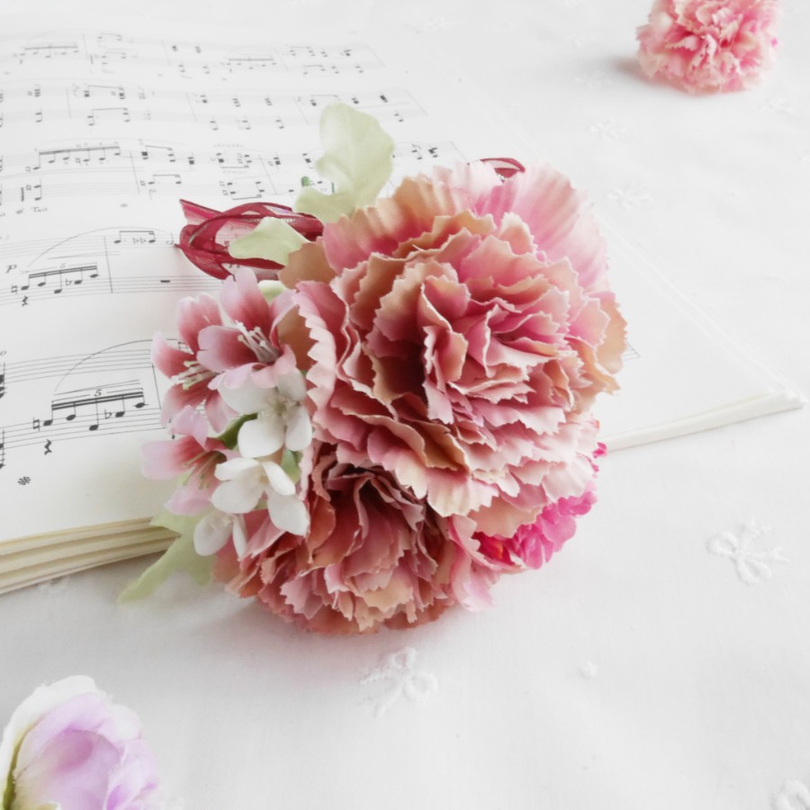 落ち着いた優しいモーブピンクのカーネーションを束ねたミニブーケです。