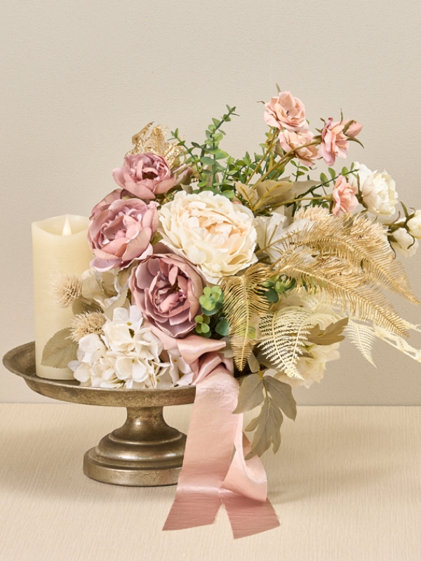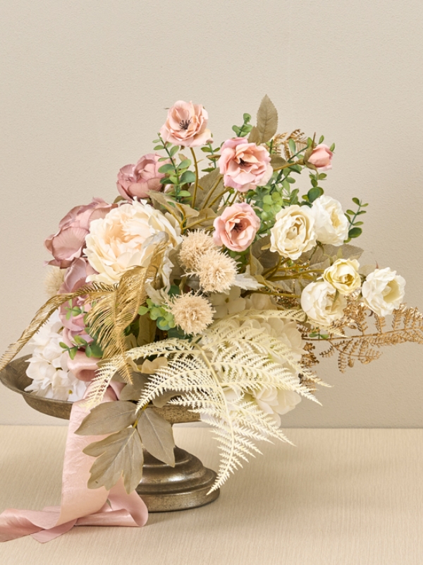 コンポート型のベースにアレンジフォームを接着して花材を挿しています。ドライ調のローズにはゴールドのリーフをプラスしてアンティークに仕上げています。