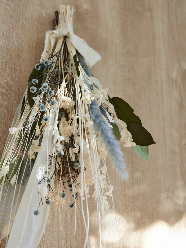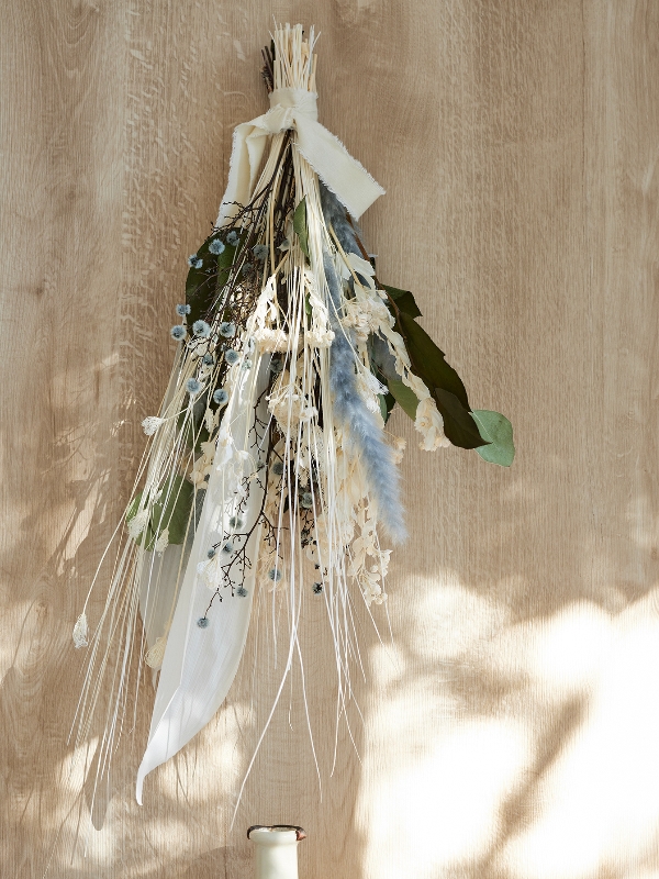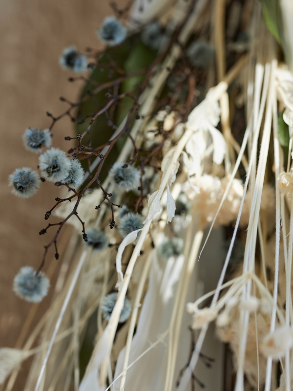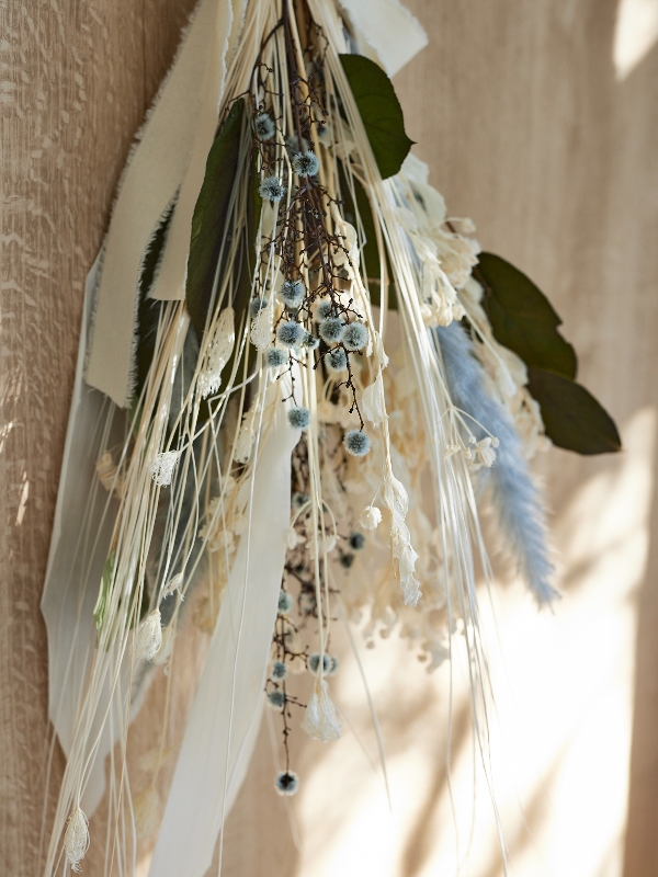 白をベースにブルーグレーのドライフラワーをプラス。