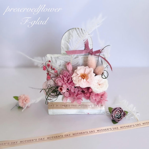 プリザーブドのカーネーション、フレンチマリアンヌ、ミルフィーユローズを使った母の日アレンジ♡