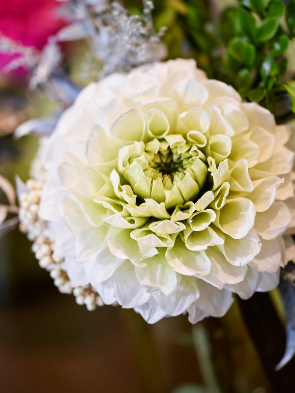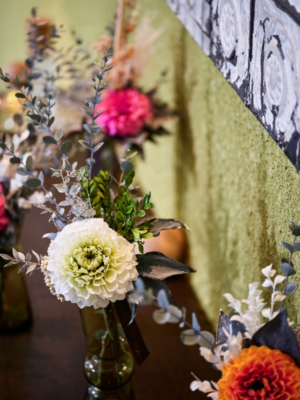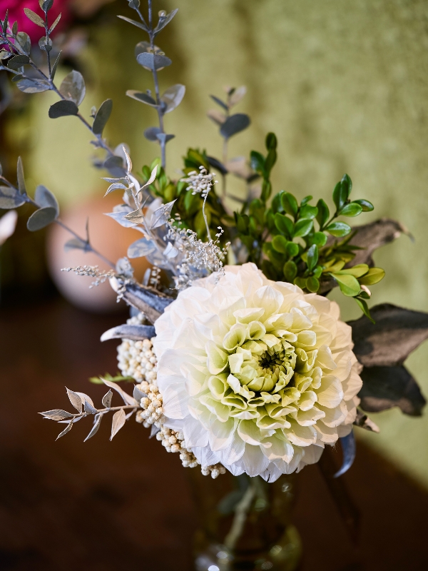 プリザーブドのダリア・グレイスをメインにしたインテリアアレンジ。