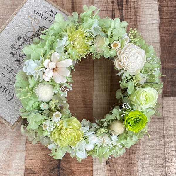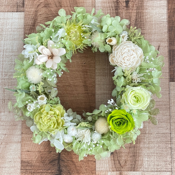 これからの爽やかな季節をイメージして、ナチュラルなリースを作りました。
