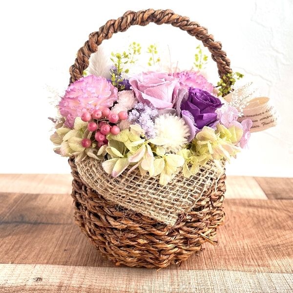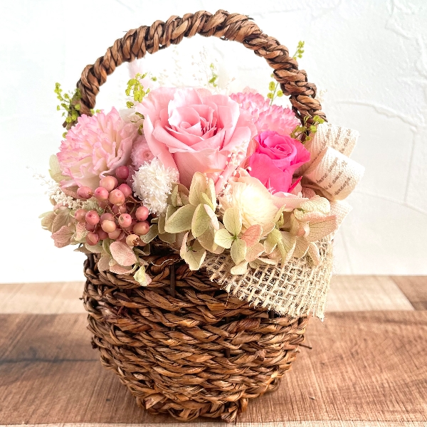 カーネーションやバラをメインにナチュラルなカゴアレンジです。