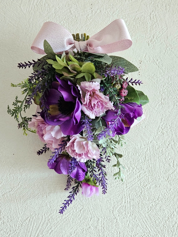 アーティフィシャルのアネモネ、カーネーション、ラベンダーをコロンと束ねた小さなスワッグです。