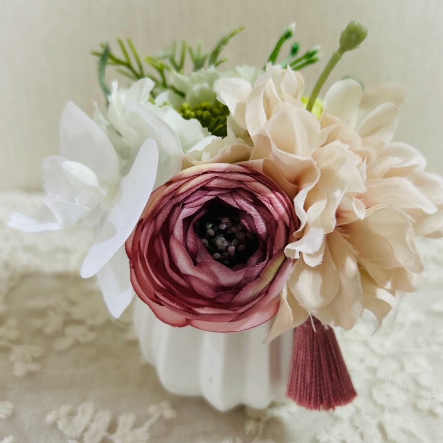 白の胡蝶蘭をポイントにした、陶器ポットの造花アレンジメントです。