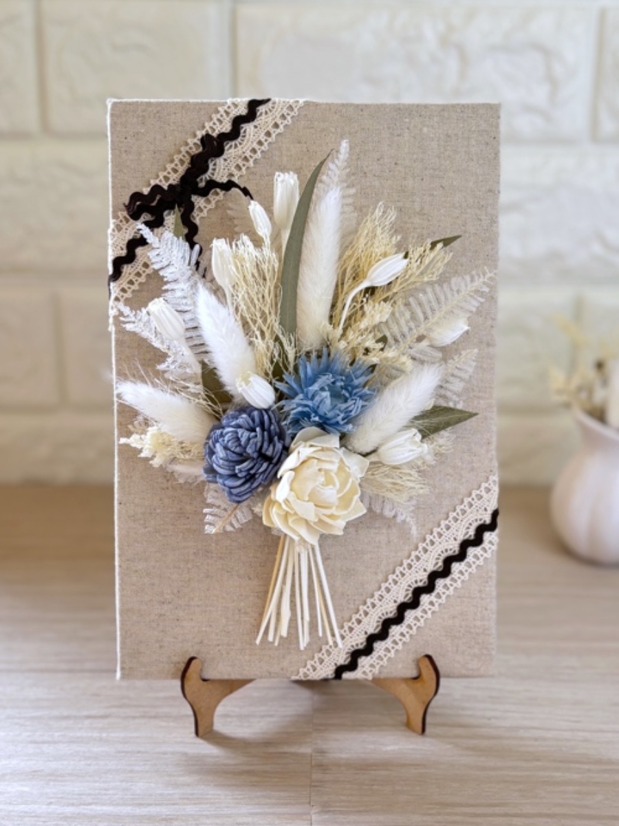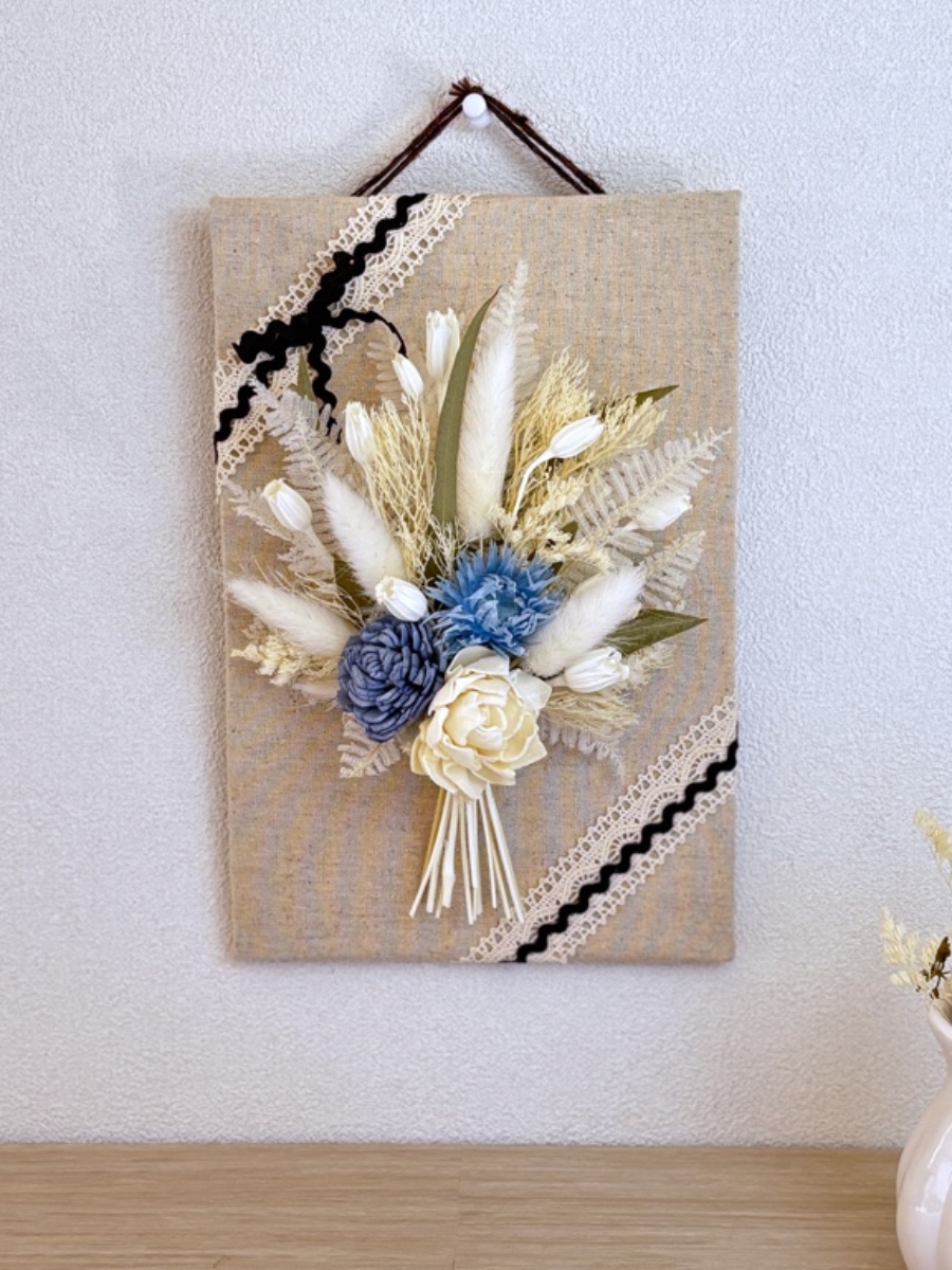 薄い板に布とリボンを貼り合わせ、優しい落ち着いた雰囲気にお作りしたフレームにドライフラワー&プリザーブドフラワーでふんわり可愛く花束のようにアレンジしました♡