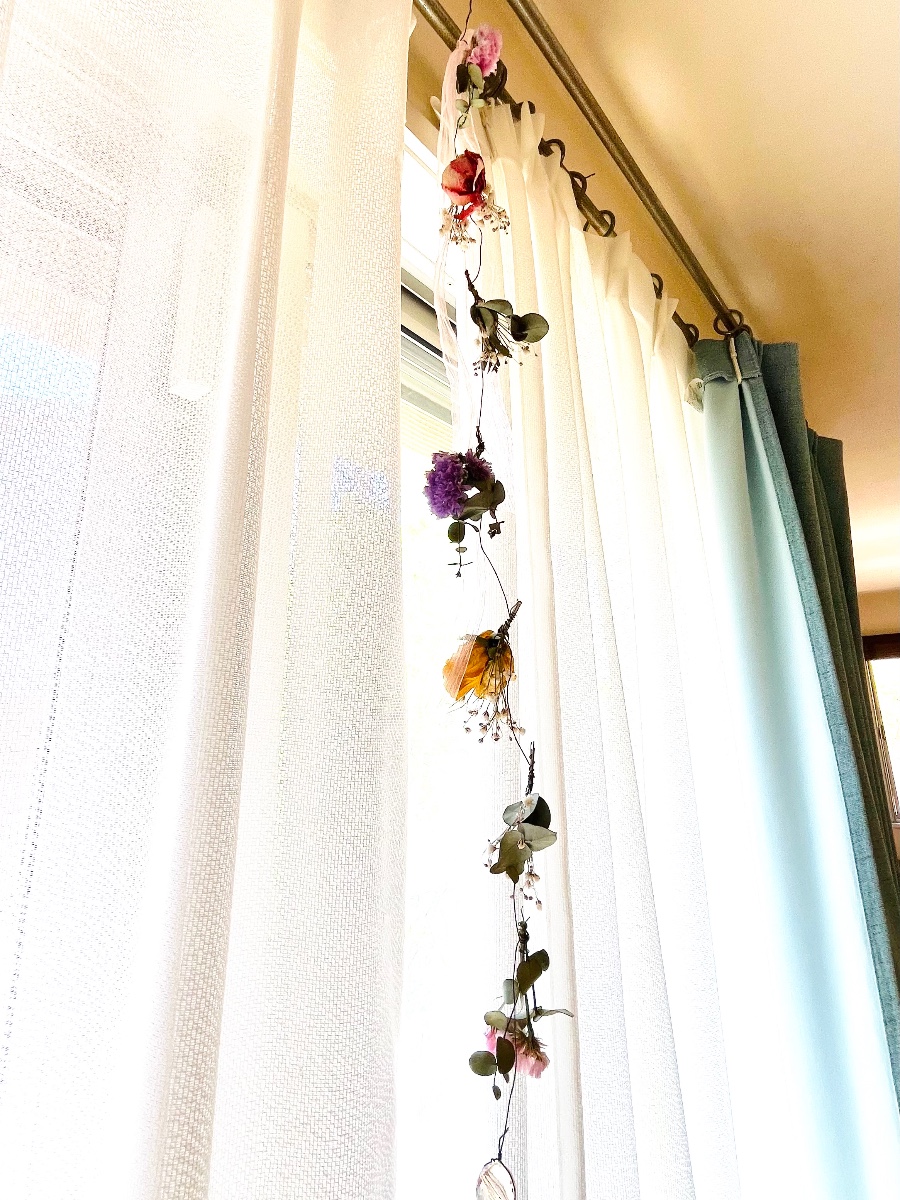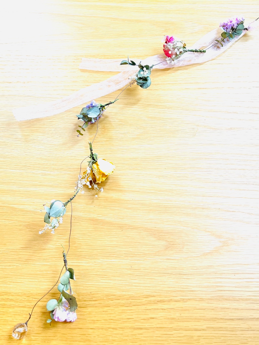 ロスフラワー対策で思いついた作品です。ドライフラワーに光があたり、風で揺れると心地良い春色ガーランドです。リースワイヤーで自在な形に仕上げて、リプレリボンでシアーで涼しげな印象を出しています。