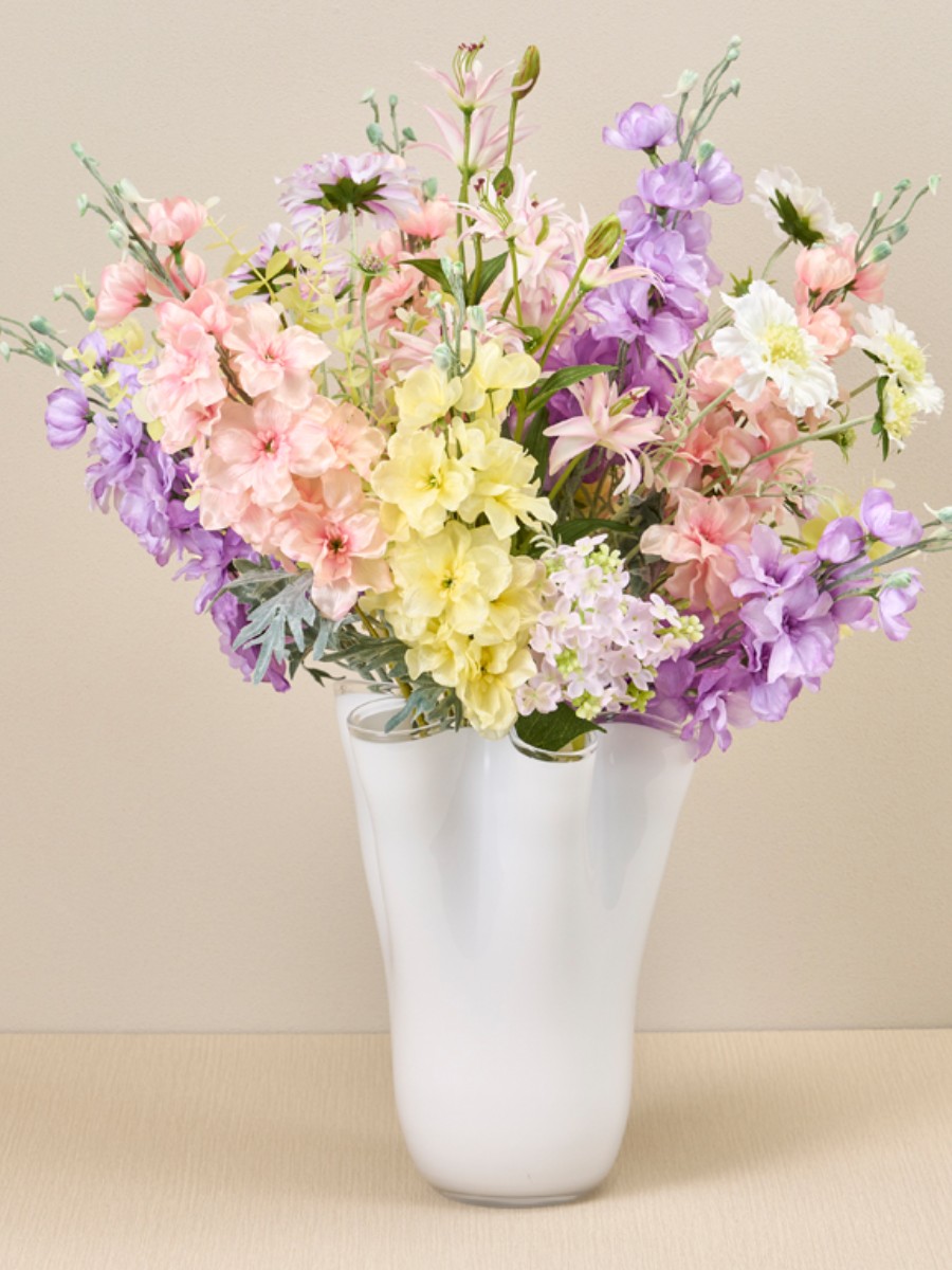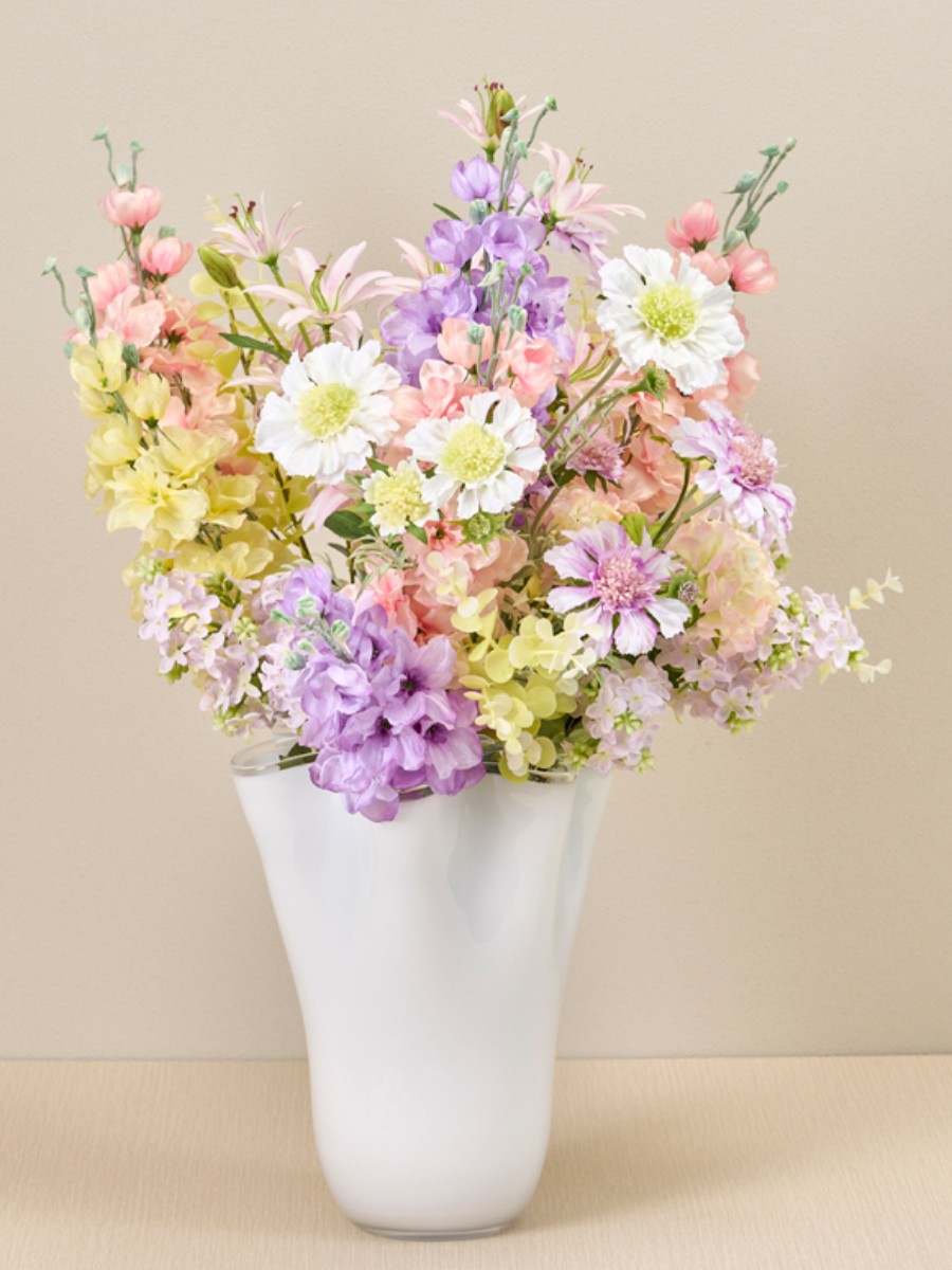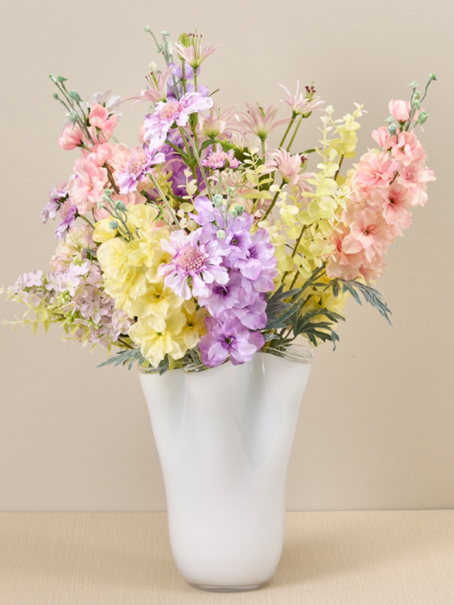 透明感のあるブルームデルフィニュームは色のトーンを合わせて色合わせをしています。ブーケ状に束ね、花器のシルエットに合わせ花を広げてふんわり仕上げるのがポイントです。