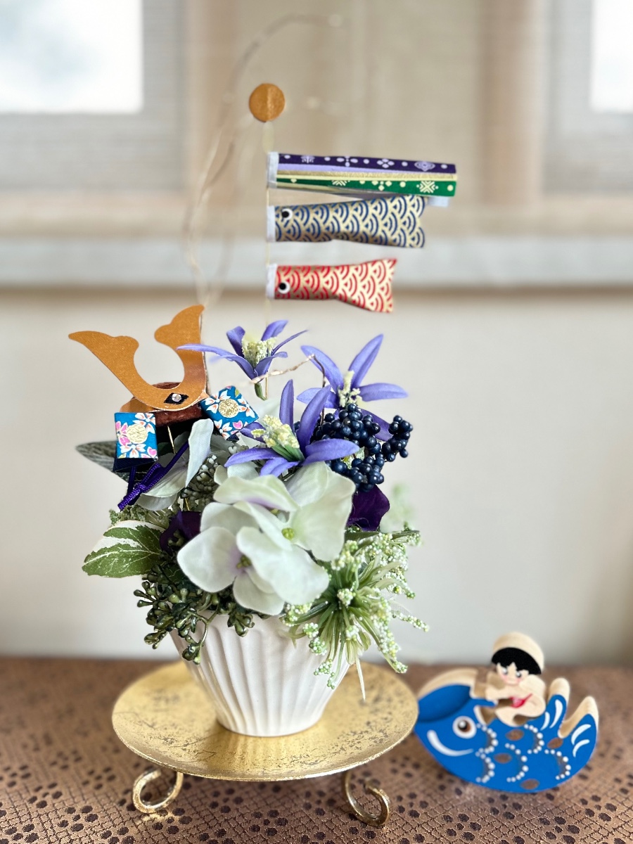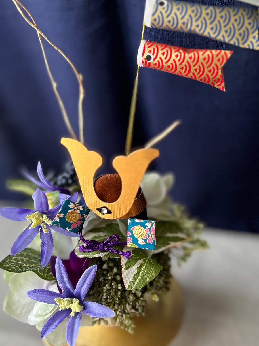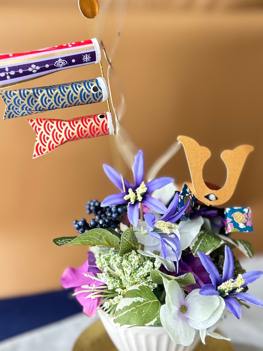 青、緑、紫色で初夏らしい爽やかなアレンジです。ゴールドの柳で空に泳ぐ鯉のぼりが風になびいている様子を表現しています。