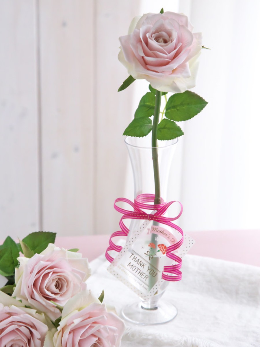 スリムでグラマラスなガラスの花器に、高品質なアーティフィシャルフラワー(造花)の淡いピンクのローズをシンプルに一輪あしらいました。