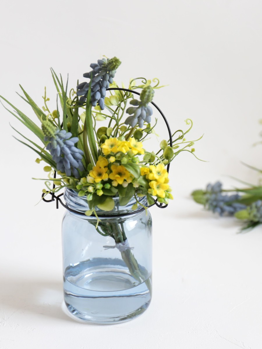 スモーキーブルーのムスカリに合わせて、ガラスポットもブルーグレーを選び統一感を持たせました。