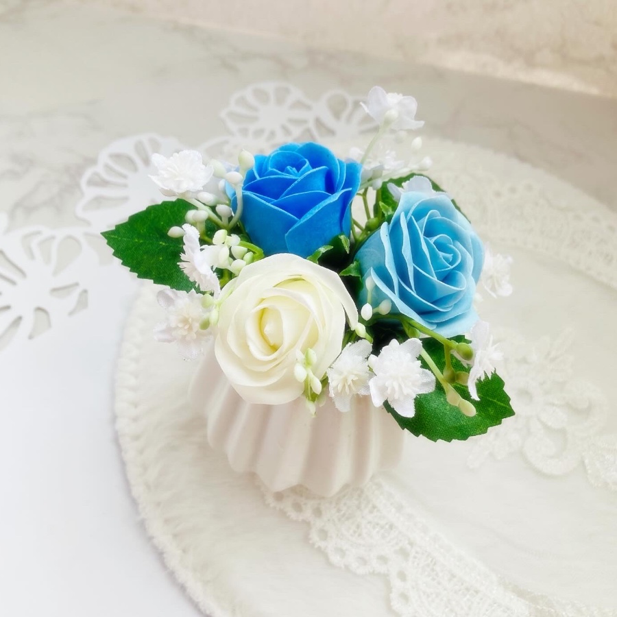 ブルーのリボンをまとわせ、お花のお色と統一感が出るよう仕上げました。