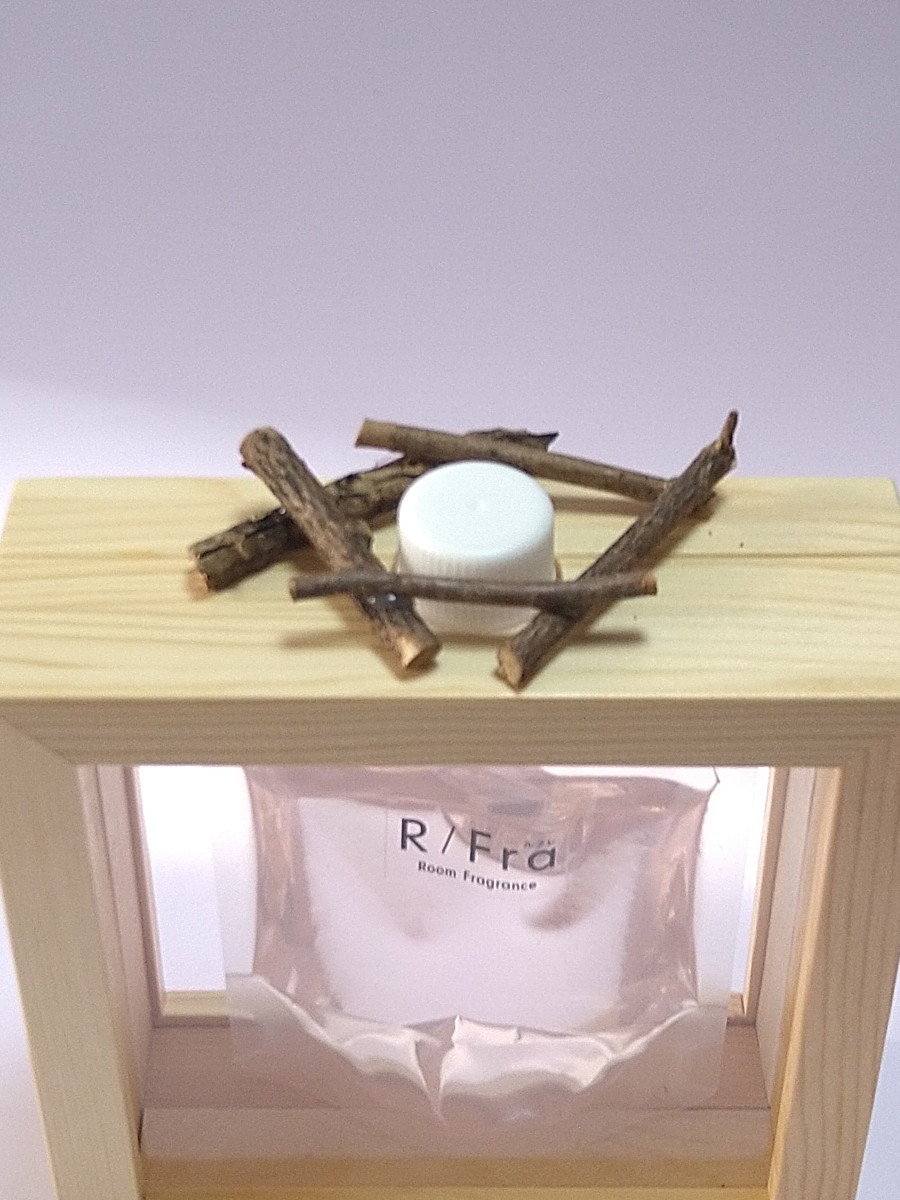 フレグランスは入れ替えて使うものなので、アレンジは取り外しできるように、小枝で枠を組んで、トップに置いているだけです。