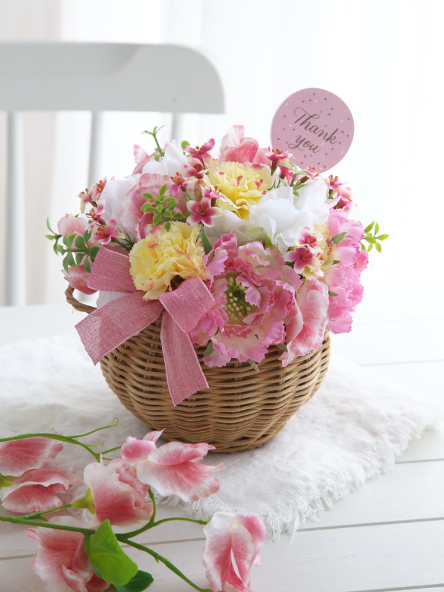 ラタンのバスケットにスカビオサ・カーネーション・スイトピーなどを丸くラウンド型にアレンジしました。