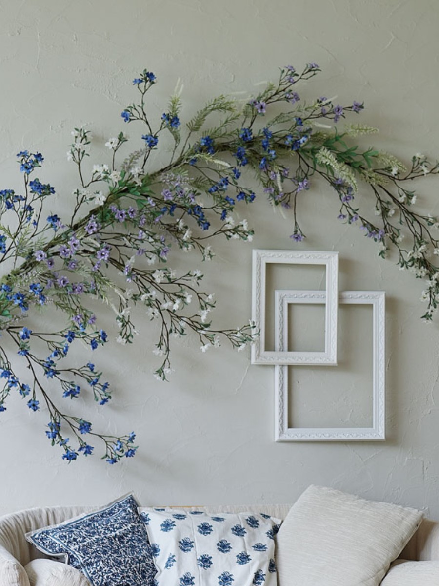 土台要らず、のびやかな枝を生かして組んだアレンジメントを大胆な壁面ディスプレイにしてみると素材の魅力が引き立ちます。