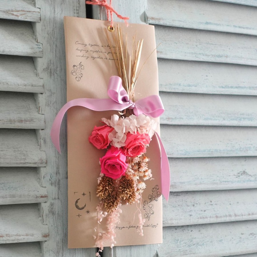 華やかなプリザーブドのローズとドライフラワーの落ち着いた色合わせがかわいいスワッグです。