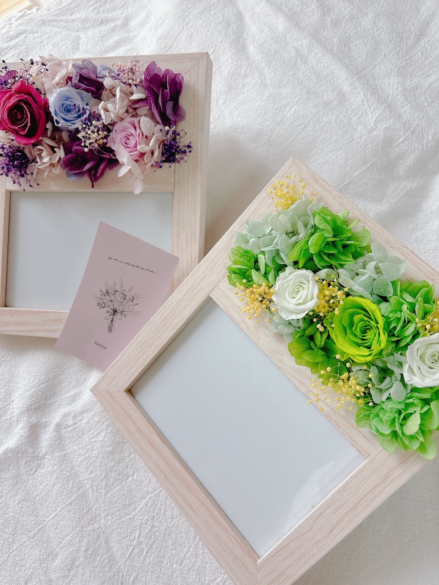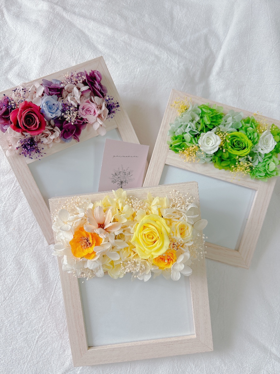 ギフトにおすすめのフラワーアレンジメントの写真立てです。