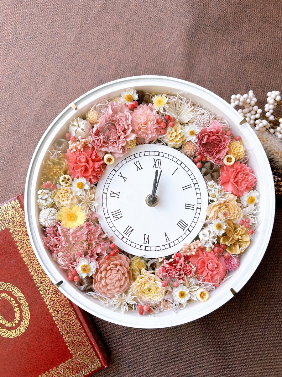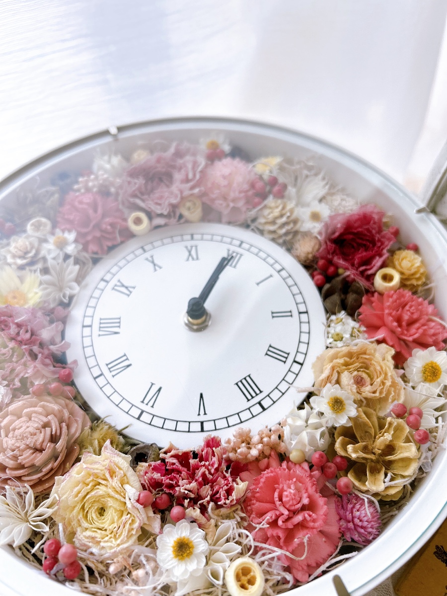 白色、丸型の時計の入れ物に、ドライフラワー、ソラフラワー、木の実をふんだんに詰め込みました。ナチュラルな色合いで季節を問いませんので、1年中飾っていただけます。お祝いの品として、喜ばれます。