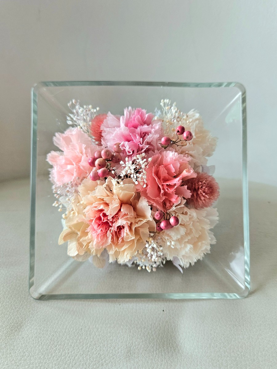 スクエアのガラス花器にプリザーブドフラワーのカーネーションをあしらった華やかなアレンジメントです。