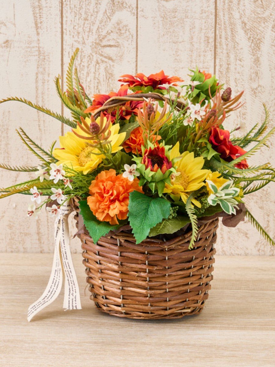 新色のオレンジとイエローのひまわりをミックスしたバスケットアレンジ。