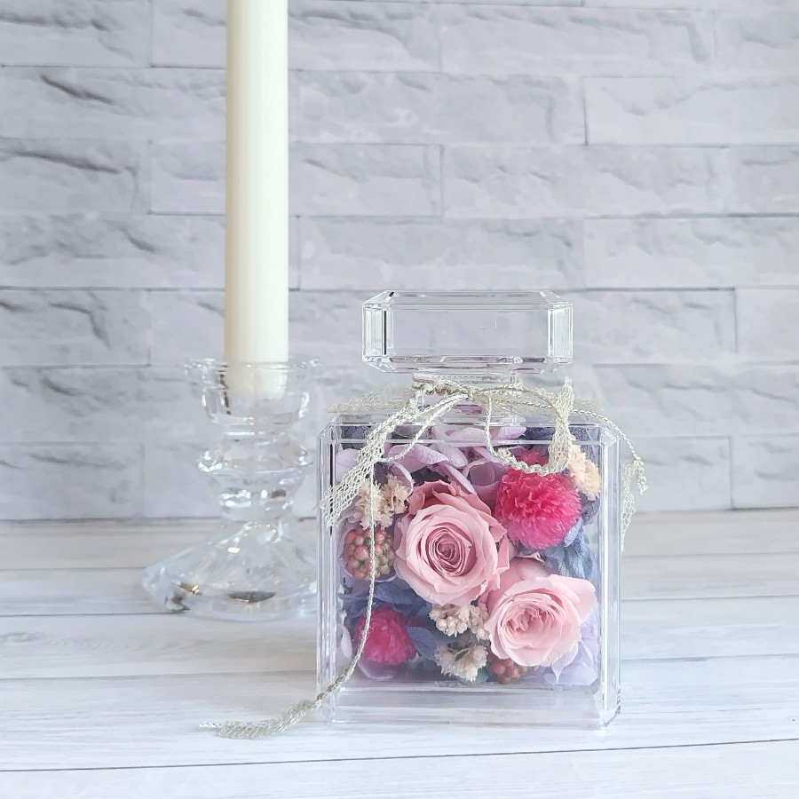 春色のプリザーブドフラワーで、優しい雰囲気のアレンジに仕上げました。