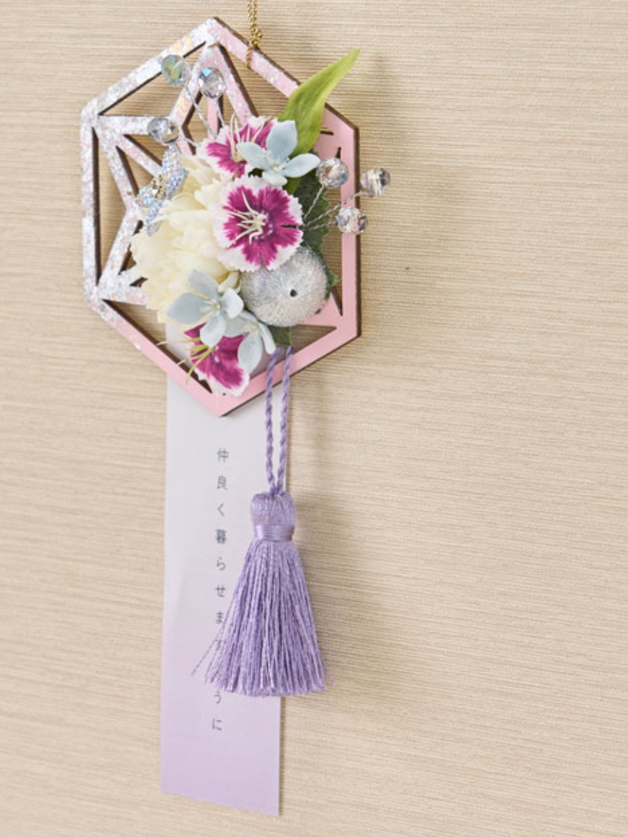 願い事を書いた短冊を貼り付けた七夕飾りのような吊るしアレンジメントです。