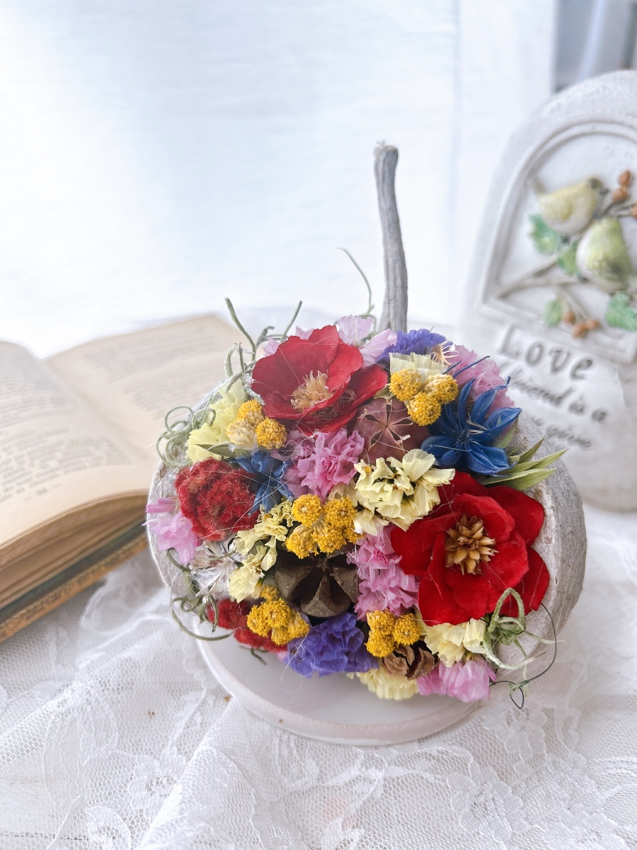 ホワイトのブッダナッツにカラフルな色のスターチス、アネモネのソラフラワー、ニゲラを使いました。夏にぴったり、トロピカルな可愛らしい作品になりました。プレゼントにも最適です。