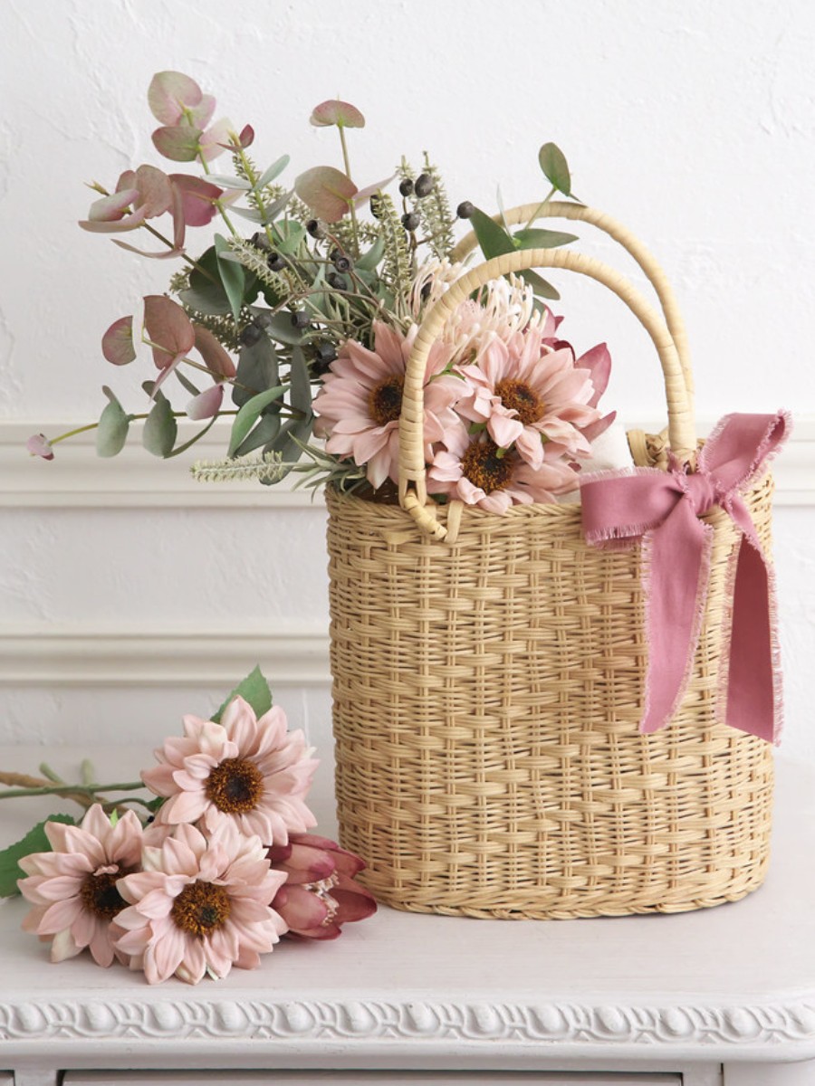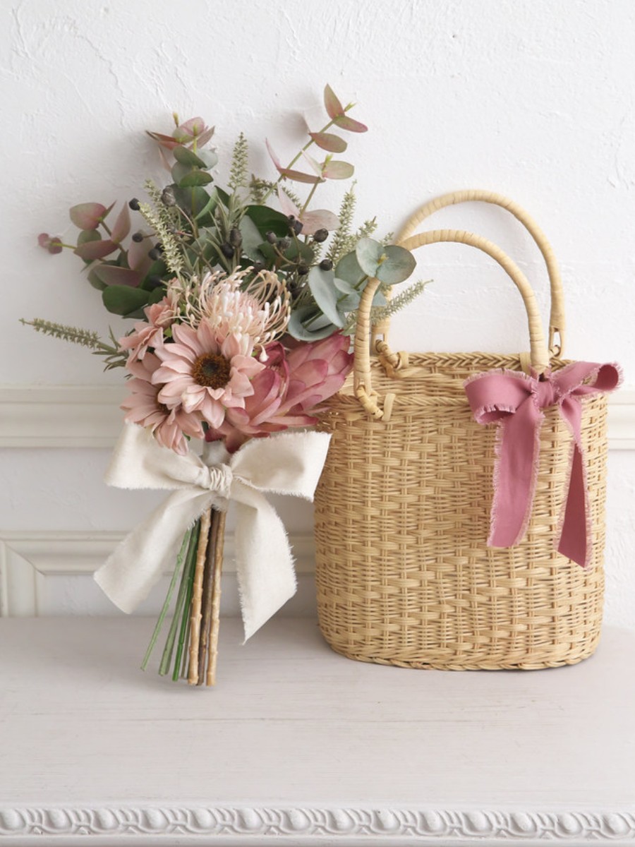 ハンドル付のラタンバスケットにブーケをセッティングしました。