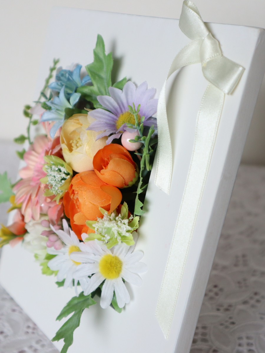 ホワイトのフレームにガーベラやラナンキュラスをアレンジしました。
