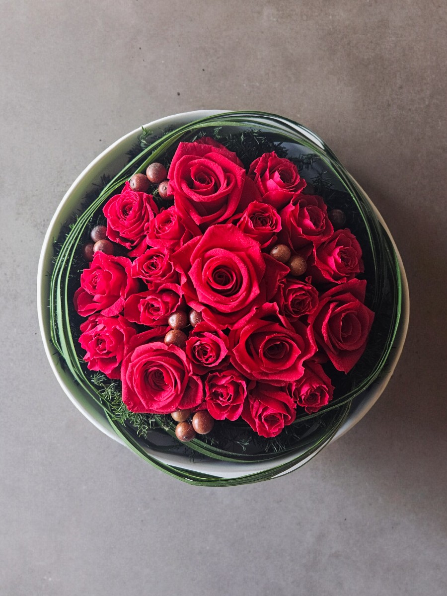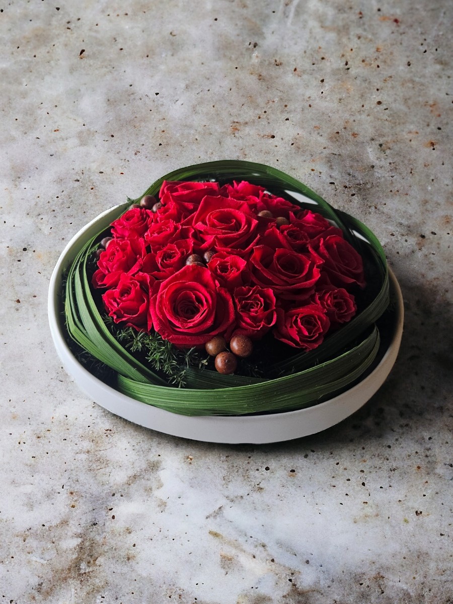 白い陶器の器にこんもりとプリザーブドローズをあしらったテーブルアレンジメントです。