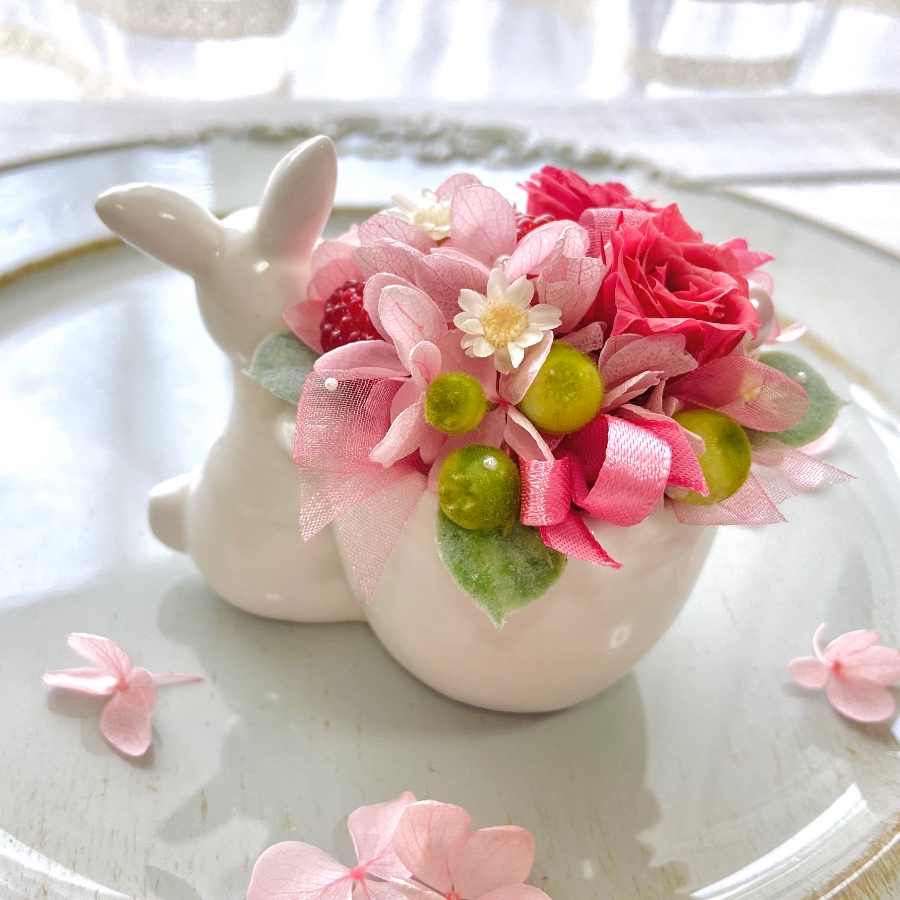 プリザーブドフラワーで作ったハートローズのアレンジとドライフラワーを封入したレジン雑貨を主に制作しています。