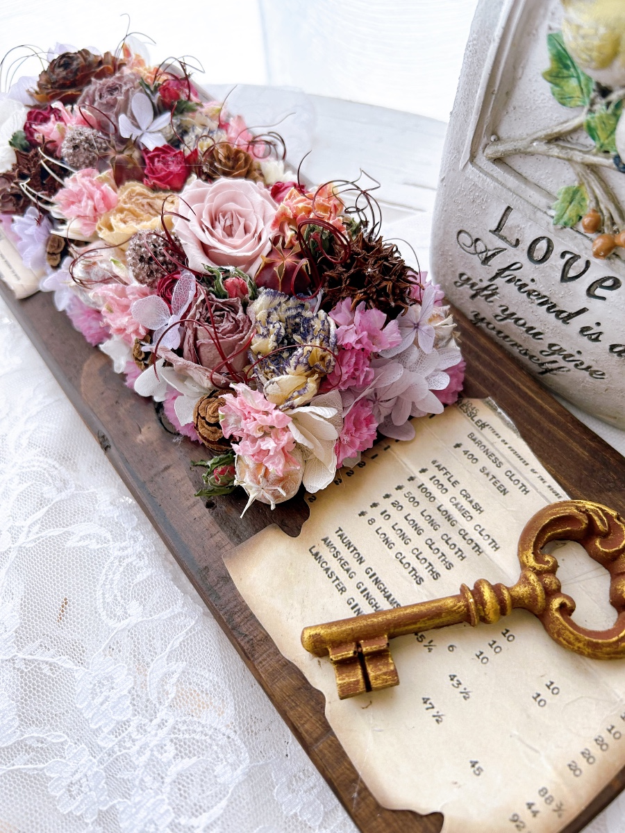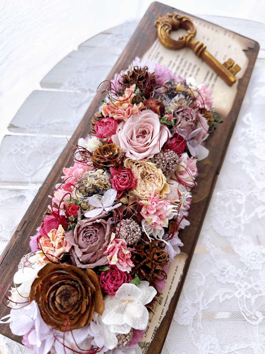 くすみカラーのバラのプリザーブド、ドライを中心に、木の実や、プリザーブドのアジサイをふんだんに詰め込みました。アートプラスター®️(韓国石膏)で作成したアンティーク調の鍵をあしらい、アロマを垂らしてアロマストーンとしても楽しんでいただけます。