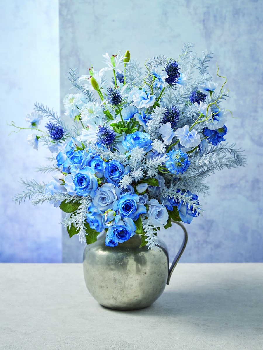 淡いブルーの濃淡にグレーのリーフを組み合わせ抽象画のような色組を楽しむアレンジです。涼しげな雰囲気は夏のインテリアに最適です。