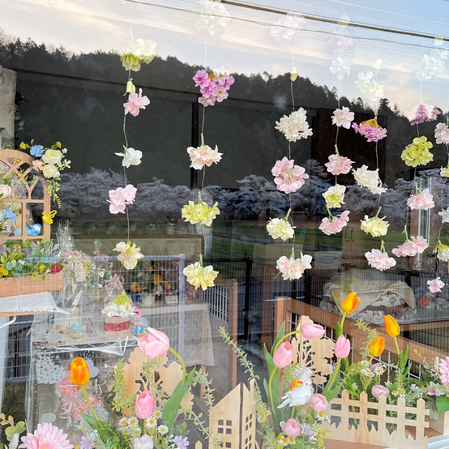 お店の窓に何か可愛い涼しげなアレンジを考えていたら